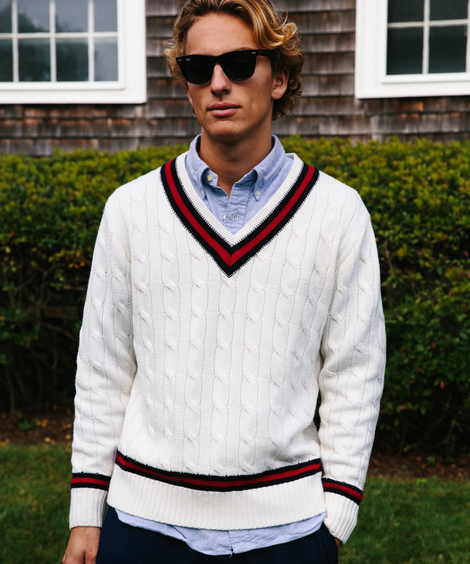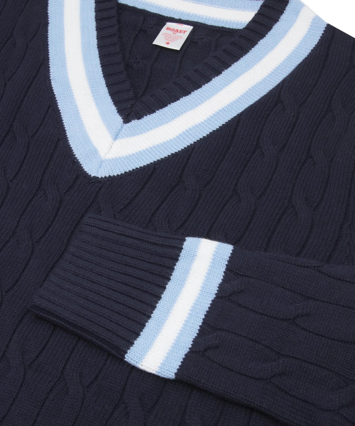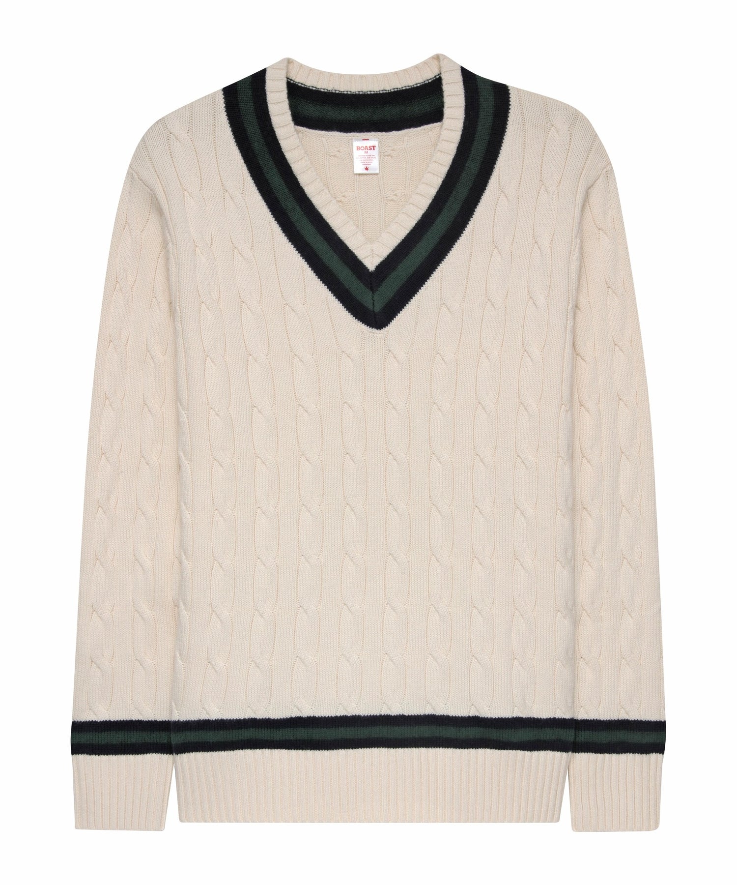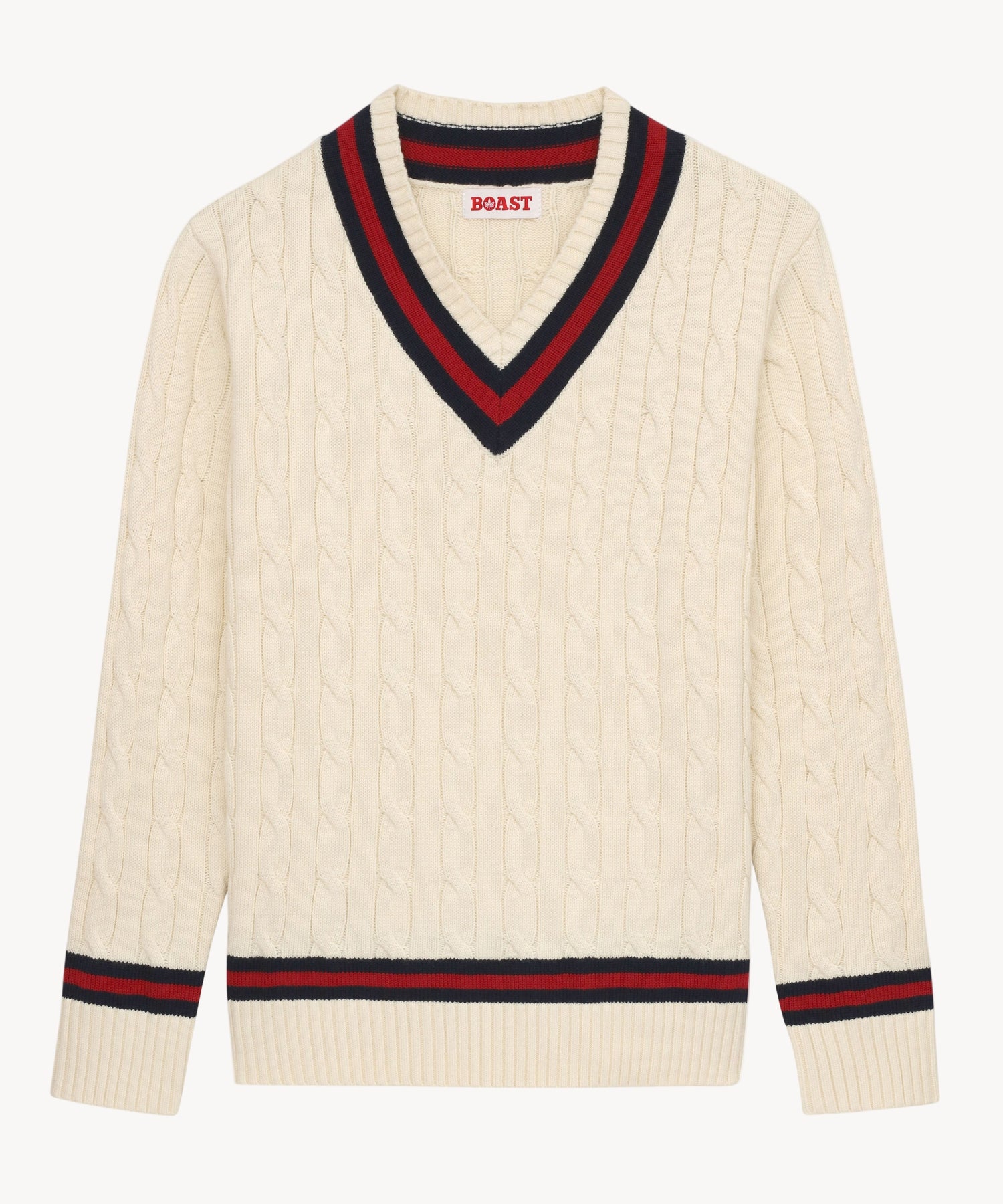 Our Cotton-blend Cable-Knit Sweater features a classic Navy/ Maroon/ Navy stripe detail on the neckline and cuffs against an Ivory body.
